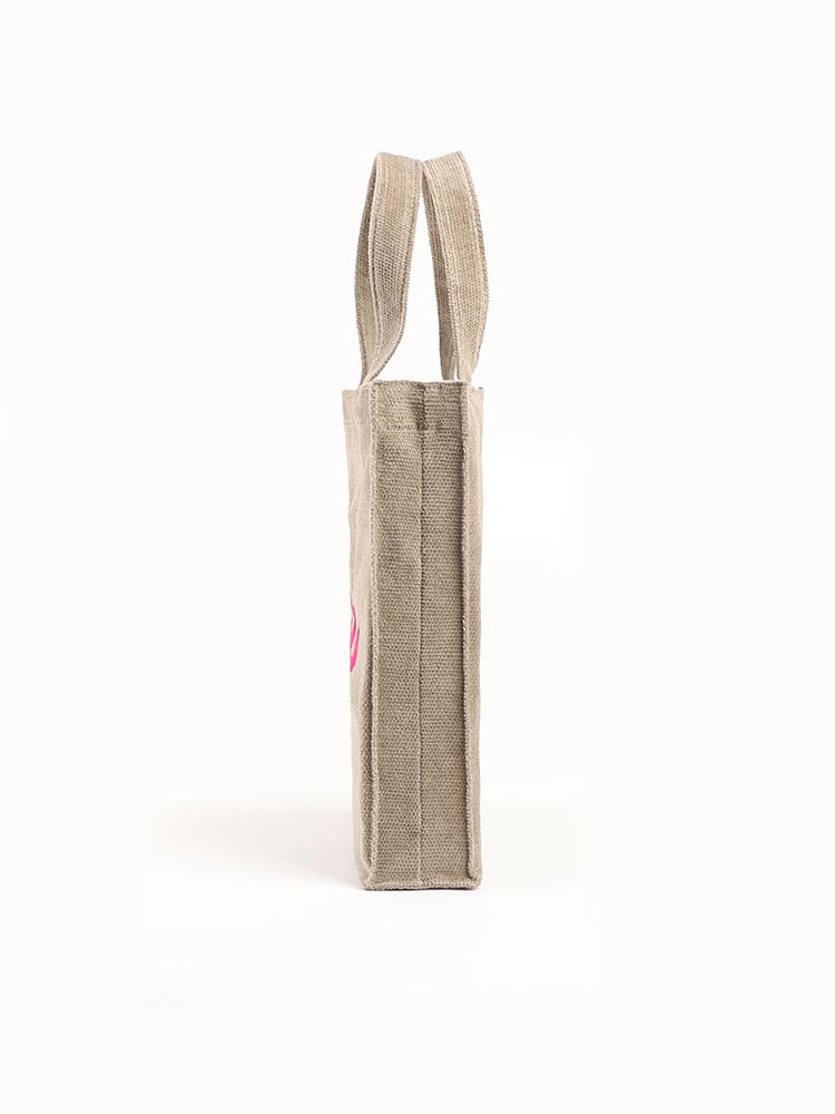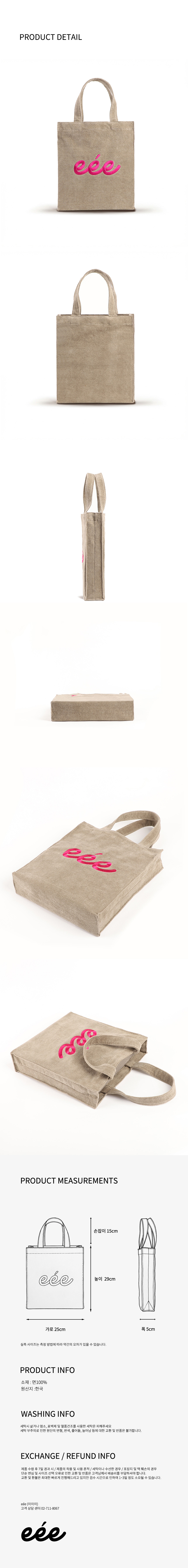 A4 용지가 들어가는 일반적인 에코백보다 아담한 크기에 손잡이가 짧아 손에 들거나 손목에 가볍게 걸쳐 연출하기 좋습니다. 지갑이나 파우치만 챙겨 나가는 가벼운 외출 시 추천해 드립니다.