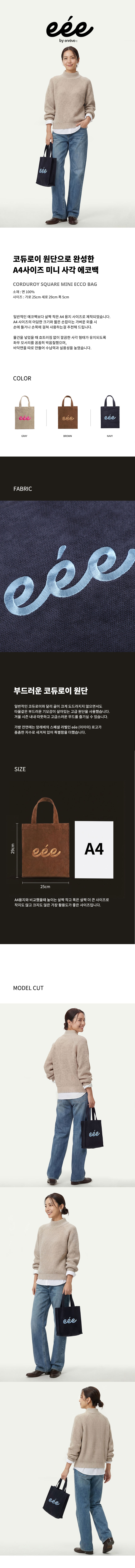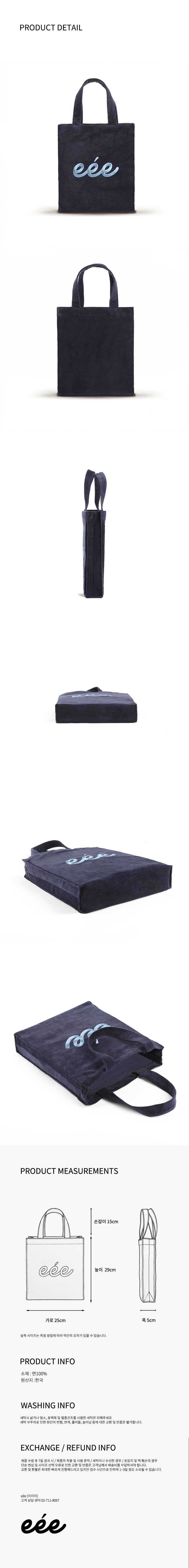 A4 용지가 들어가는 일반적인 에코백보다 아담한 크기에 손잡이가 짧아 손에 들거나 손목에 가볍게 걸쳐 연출하기 좋습니다. 지갑이나 파우치만 챙겨 나가는 가벼운 외출 시 추천해 드립니다.