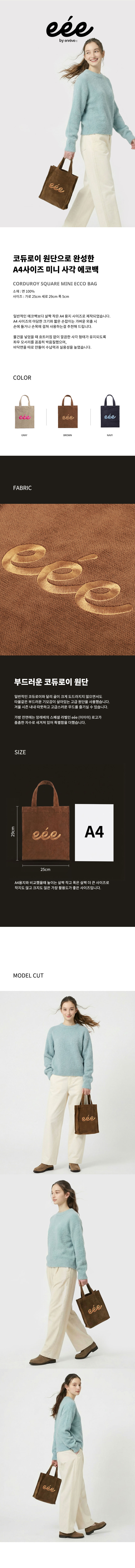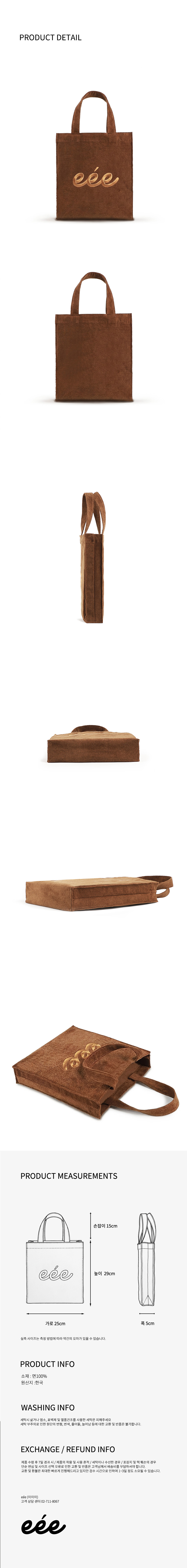 A4 용지가 들어가는 일반적인 에코백보다 아담한 크기에 손잡이가 짧아 손에 들거나 손목에 가볍게 걸쳐 연출하기 좋습니다. 지갑이나 파우치만 챙겨 나가는 가벼운 외출 시 추천해 드립니다.
